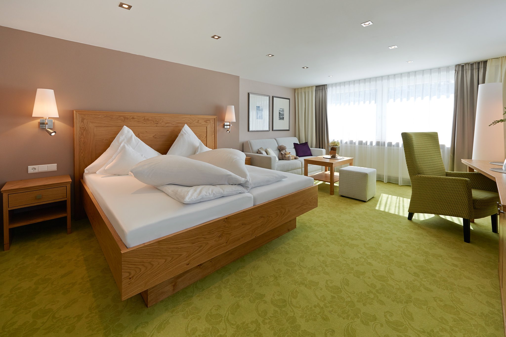 Unsere Juniorsuiten (36m²) in modern frecher Eleganz, mit Panoramablick, ausgestattet mit großer Sitzecke, Kabelfernseher, Zimmersafe, Westbalkon mit Blick über Lech. Das Badezimmer ist ausgestattet mit Doppelwaschbecken, Badewanne mit Duschwand, sowie Kosmetikspiegel und Haartrockner. Die Toilette ist separat.